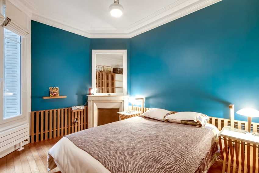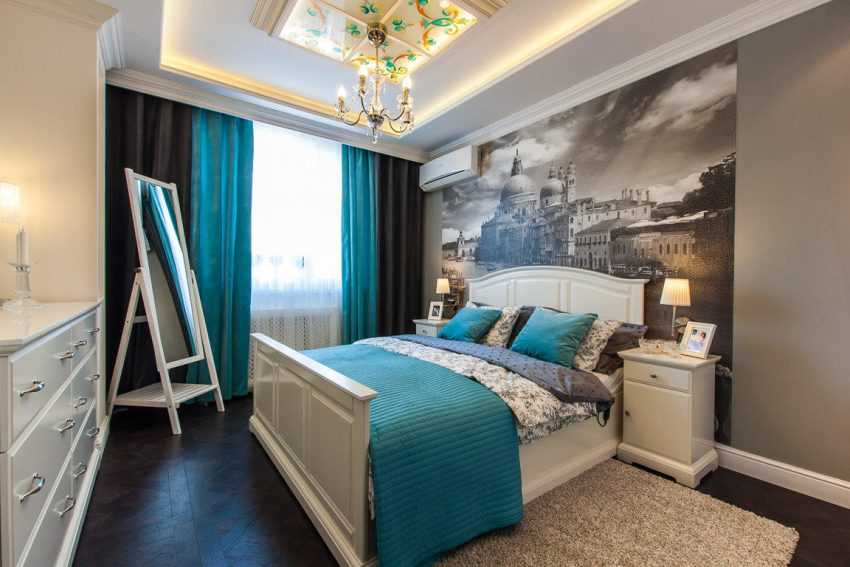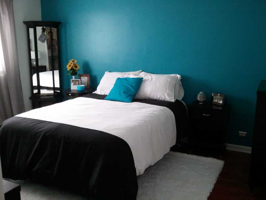 В бирюзовой спальне важно соблюдать баланс при цветовом оформлении. Бирюза должна присутствовать или в отделке на стене, или на мебели