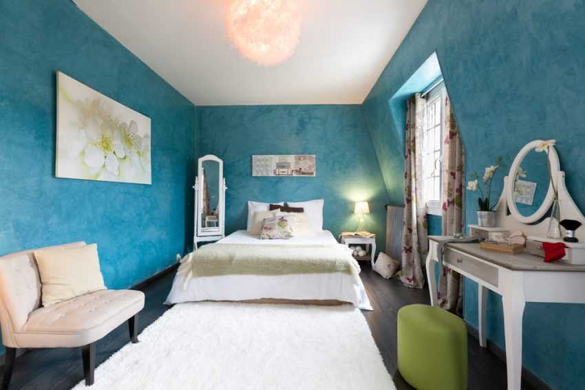 На фото спальня со стенами бирюзового цвета, оформленными декоративной штукатуркой.