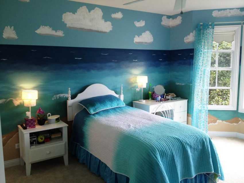 - сочетание бирюзовых, синих, зеленых красок привнесет в комнату «морское» настроение. Палитра в светлых пастельных тонах придаст обстановке нежности. А более насыщенные краски сделают интерьер активным, энергичным;