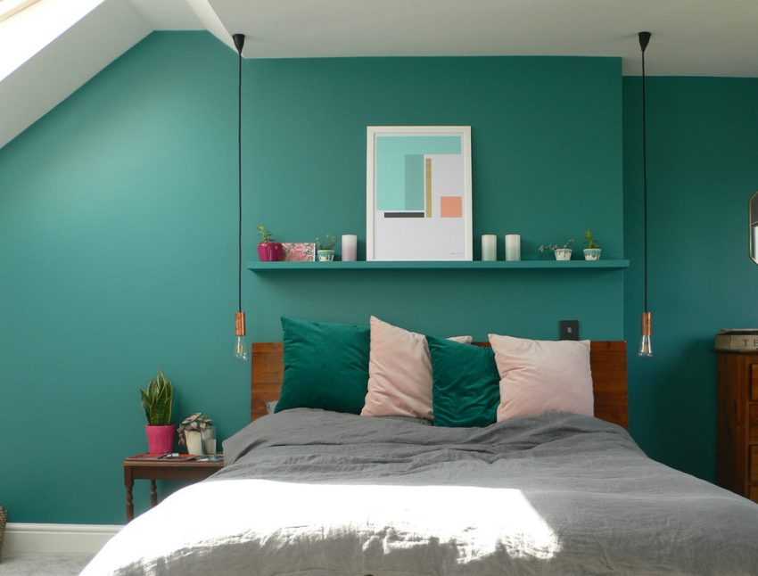 Универсальным является темно-бирюзовый цвет в спальне. Неброская и не вызывающая цветовая гамма гармонично сочетается с приглушенными лиловыми, песочными или коралловыми оттенками и создает природные и естественные дуэты.