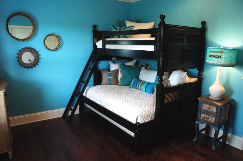 Бирюзовый отлично подходит для оформления спален для детей, особенно для морского интерьера. В сочетании с коричневым, белым и желтым он создаст яркую, но уютную обстановку, которая максимально располагает к полноценному отдыху ребенка. Подобные комбинации успокаивают, обеспечивают нормальный сон и помогают снять негативные последствия стрессовых ситуаций.