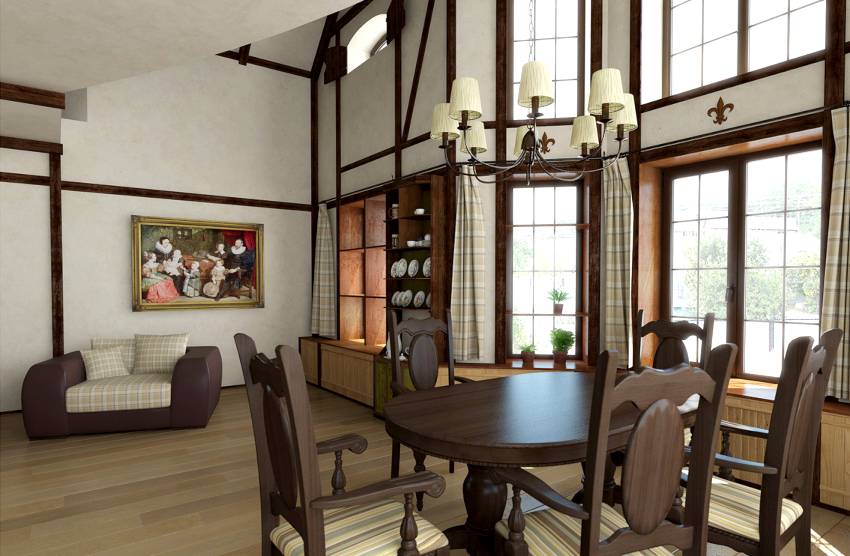 Характерными чертами немецкого кантри являются аккуратность, сдержанность и практичность. В интерьере должно быть обилие дерева, что проявляется в отделке стен и потолка в виде балок, стоек для лагов, мебели и декоре