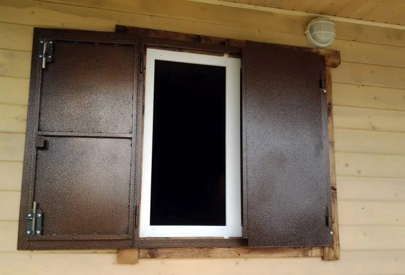 - Для того чтобы изготовить железные ставни на окна, вам будет нужен уголок 50, он пойдет на лутки ставен, стальной лист по размеру оконного проема толщиной 2 – 3 мм. Для армирования полотна и придания ребер жесткости, можно использовать швеллер, трубу квадратного сечения или уголок. Основное требование – ребро жесткости не должно выступать за контуры ставен.