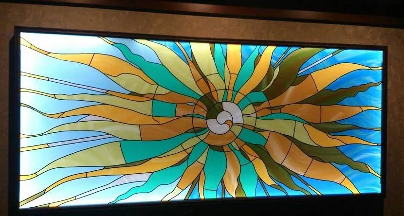 Большинство витражных полотен своими рисунками несут смысловую нагрузку. Поэтому разумно, когда подсветка делает акцент именно на важные детали. Одним из самых распространенных приемов является установка светильника за изображением солнца, если оно есть в композиции. Таким образом создается имитация лучей, отходящих от светила.