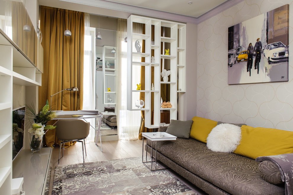 При острой необходимости зонирования пространства следует выбирать компактный стеллаж облегченного дизайна. В основе может быть профильная труба, а сама конструкция должна занимать лишь небольшую часть помещения. Тогда удастся не загромоздить пространство, а интерьер станет выглядеть более изысканным.