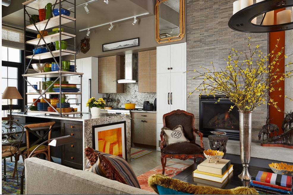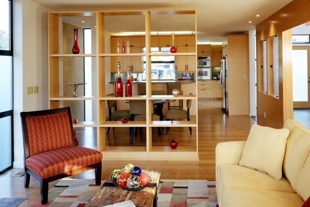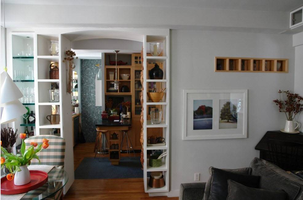 В интерьер кухни-гостиной или кухни-столовой гармонично впишется шкаф или стеллаж. Такая перегородка станет удобным местом для хранения кухонных принадлежностей.