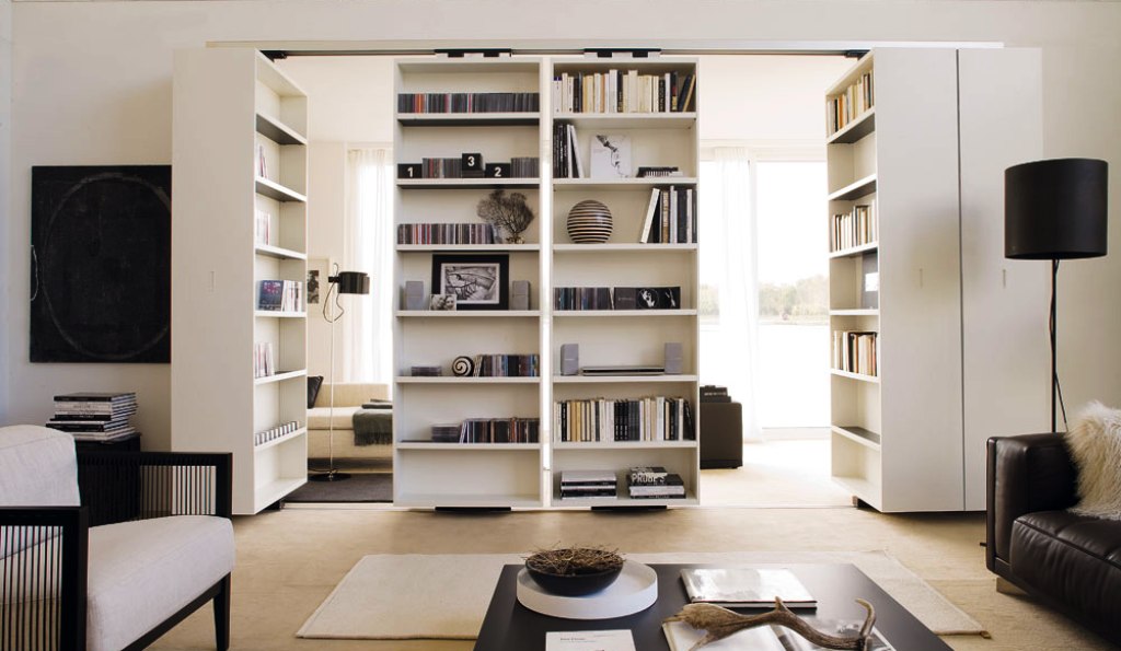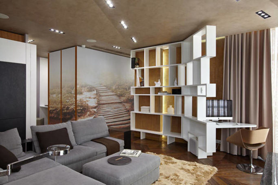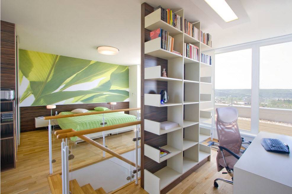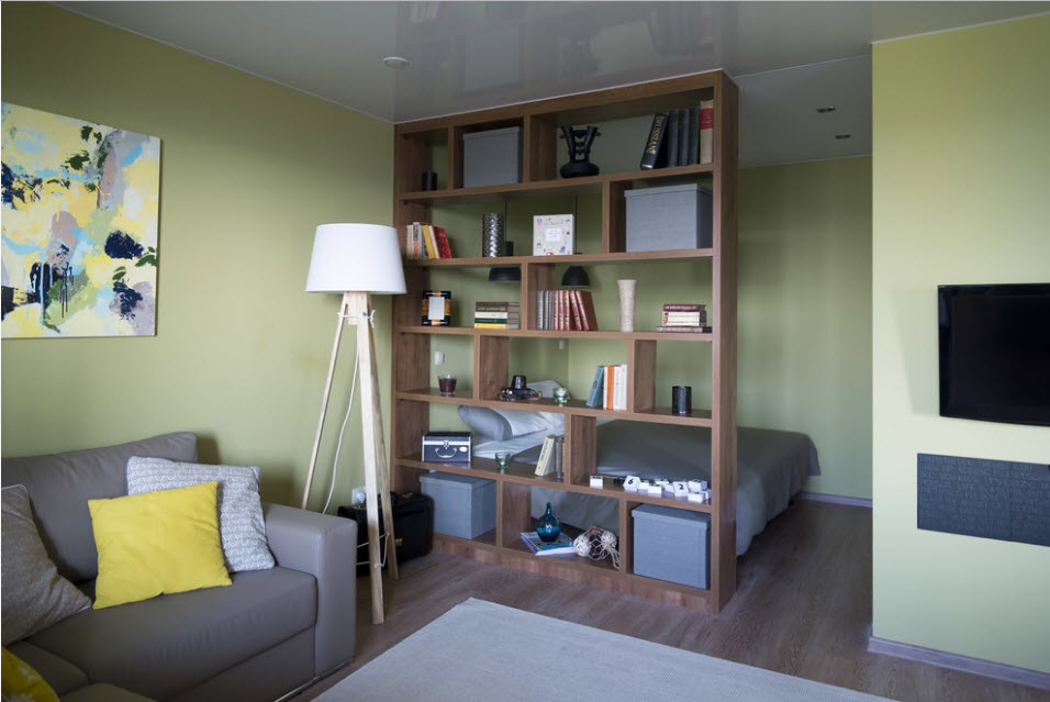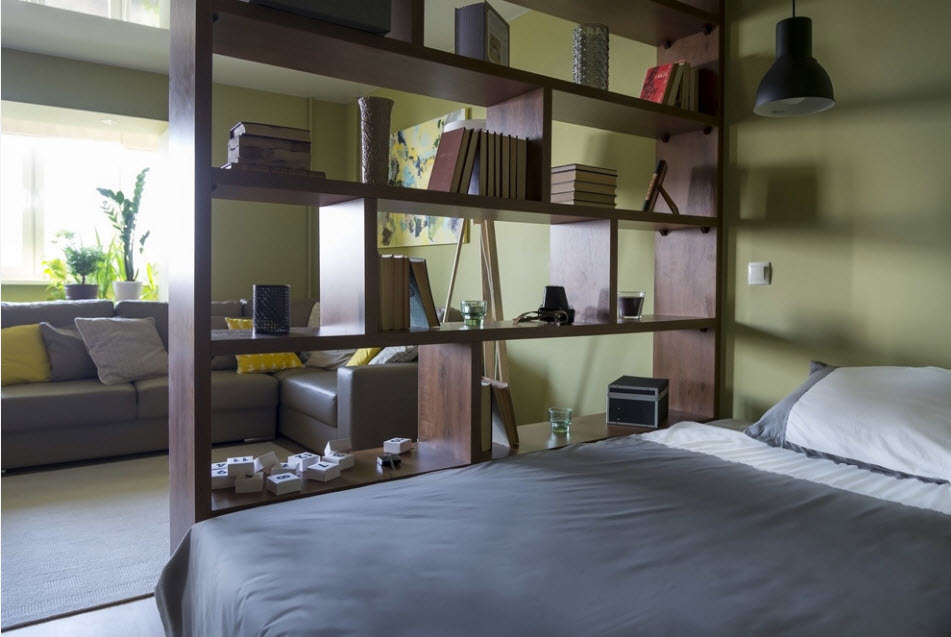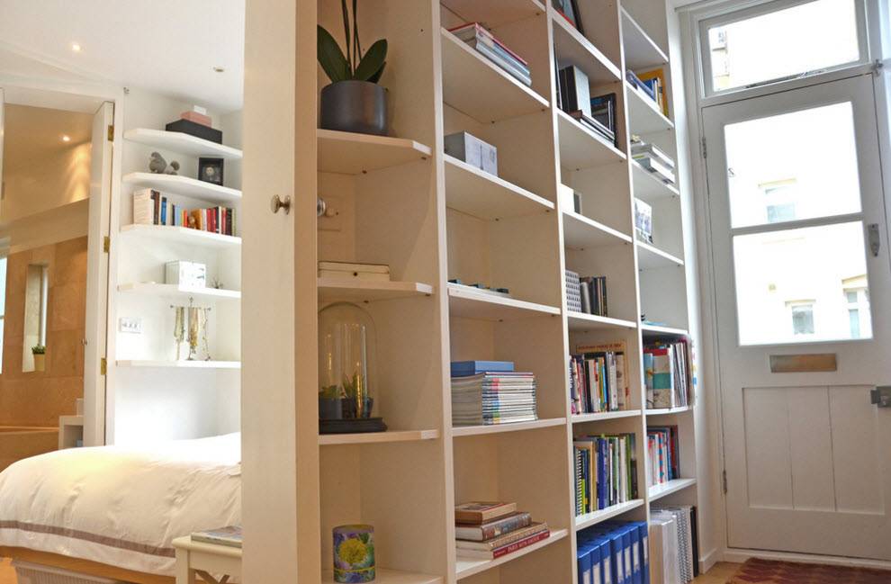 Если со шкафом все ясно, то стеллаж может быть сплошным, с пустыми «окнами» или глухим только с одной стены. В маленьких комнатах такой способ лучше не использовать – иначе зоны будут казаться совсем крохотными.