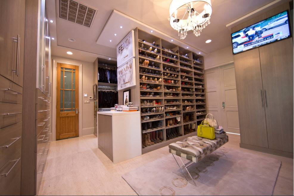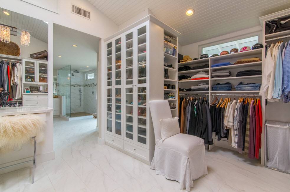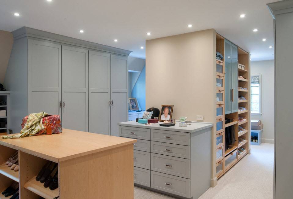 Здесь внешний вид стеллажей несколько отличается от тех, что располагаются в помещениях других назначений. Все объясняется необходимостью размещения предметов, которые не должны быть видны домочадцам и гостям. Хорошо, если конструкция будет иметь мягкую подсветку, которая дополнительно выполнит роль ночника.