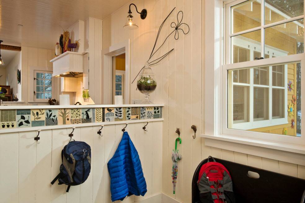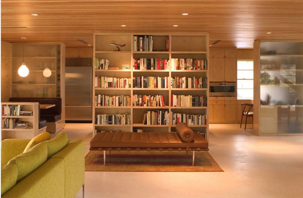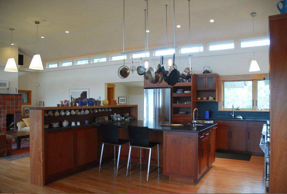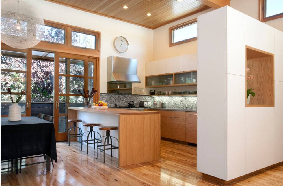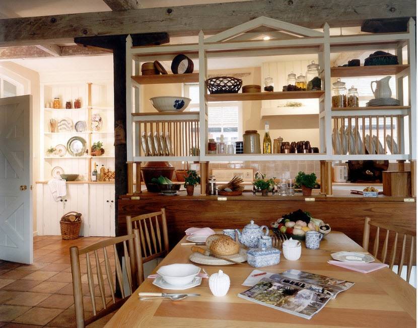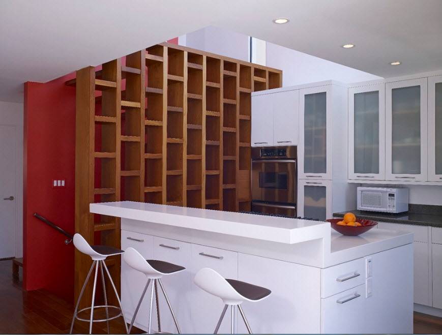 В данном интерьере невысокий стеллаж входит в состав выступающие части кухонного гарнитура. Такое решение позволяет отделить рабочую зону от столовой, выберите место для хранения книг или другого декора.