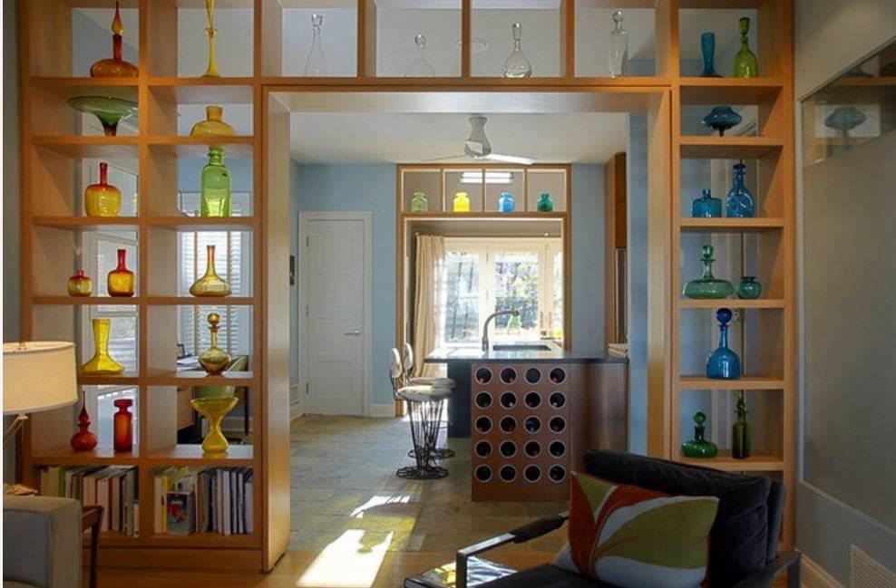 Популярностью пользуются комбинированные конструкции, которые состоят из шкафа и стеллажа. Такая перегородка служит местом для хранения вещей и в тоже время является декором.