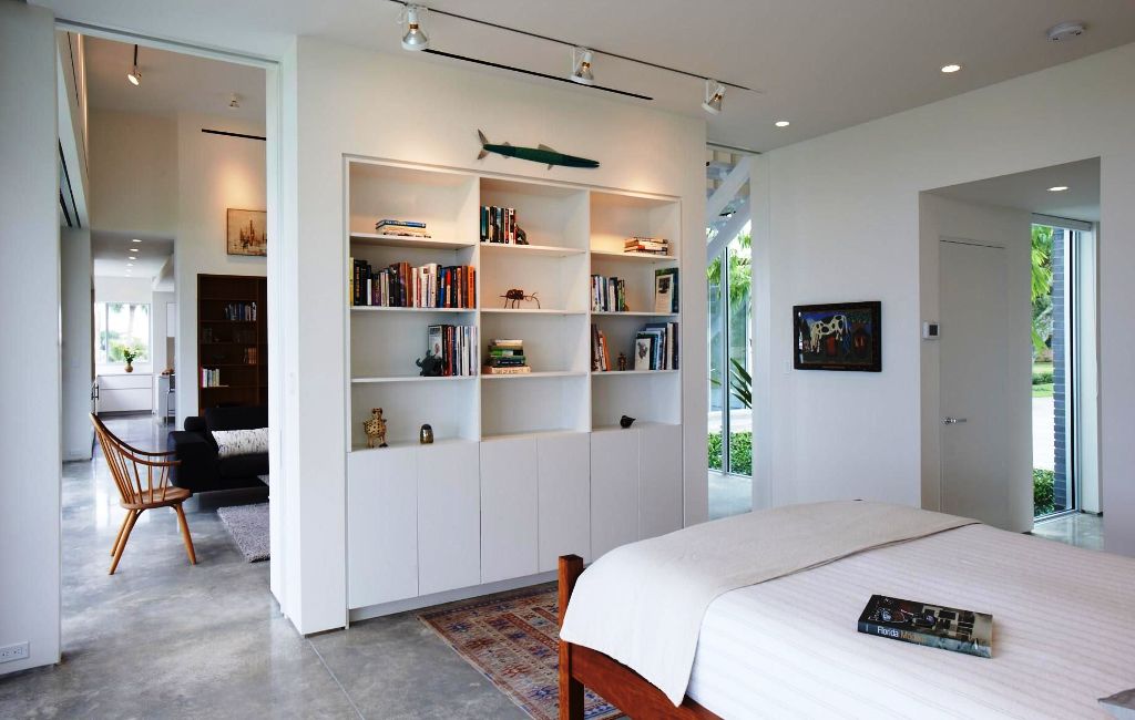 Стеллаж в интерьере спальни-гостинойИсточник design-homes.ru