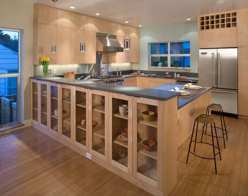 В просторных кухнях шкаф можно установить таким образом, что кухонная зона будет выглядеть как изолированное помещение. В представленном варианте в центре шкафа сделали удобную рабочую зону.