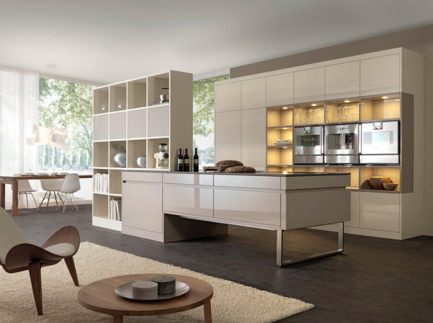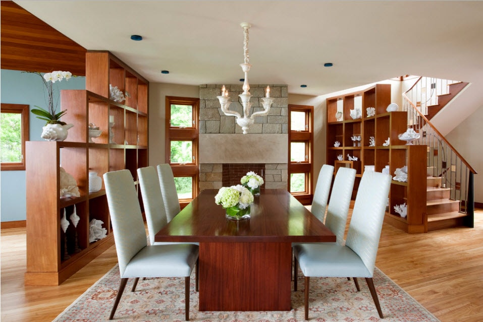 Для зонирования обеденной зоны предпочтение отдают ультрасовременным моделям из дерева или стекла и хромированного металла, полки которых содержат тематические предметы декора и экстравагантные сервизы. Такой прием весьма характерен для оформления помещения в скандинавском стиле.