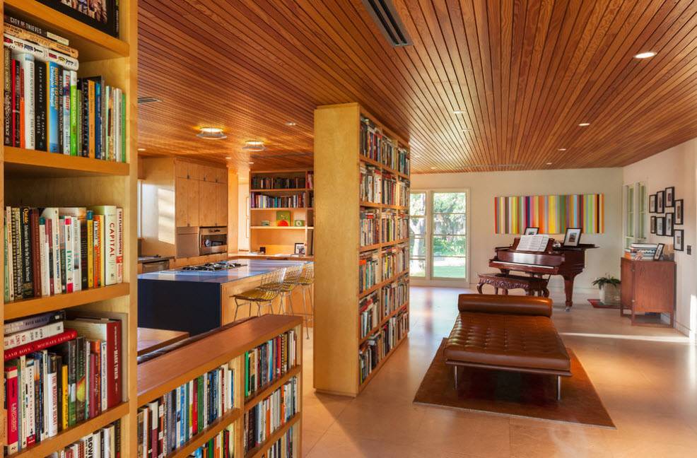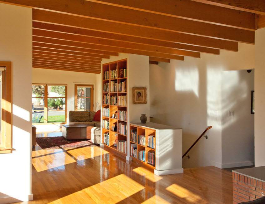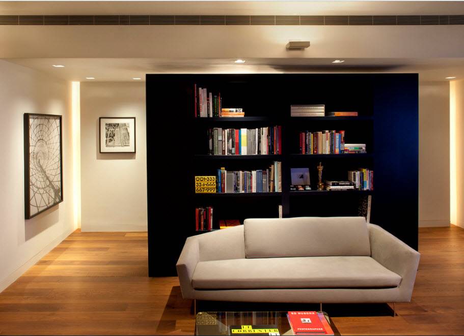 В большой гостиной стеллаж-перегородка – отличная идея ее разделения на зону отдыха и рабочий кабинет. В такой планировке можно удобно и доступно поместить все необходимое для работы – книги, бумагу, справочники, диски и другие принадлежности.