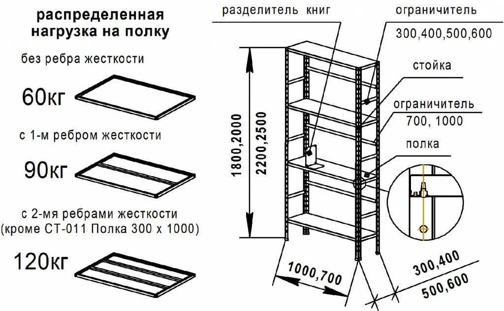 - В некоторых случаях задняя стенка стеллажа усилятся специальными распорками.