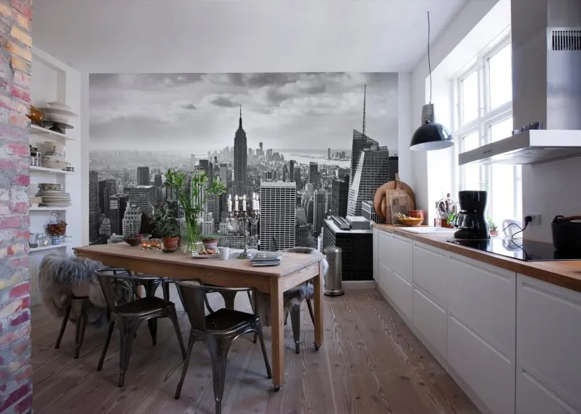 Хорошим эффектом выделения обладают фотообои. Если подобрать правильное (панорамное) изображение, оно поможет зрительно расширить пространство.