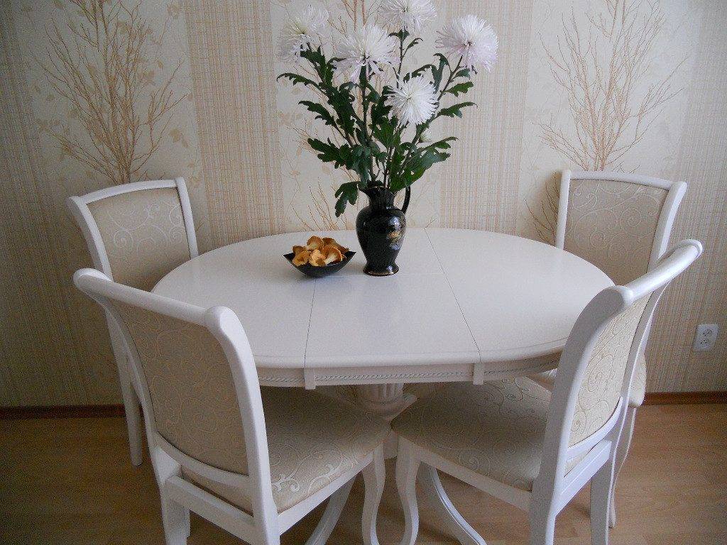 - столы-вкладыши состоят из двух частей в форме полукруга и двух прямоугольников, спрятанных внутри конструкции. Для того, чтобы разложить стол, половинки раздвигают. Два дополнительных элемента поднимают и устанавливают в центральной части, после чего полукруги сдвигают, состыковывая пазы. Получается овальная столешница, которая больше исходной на треть;