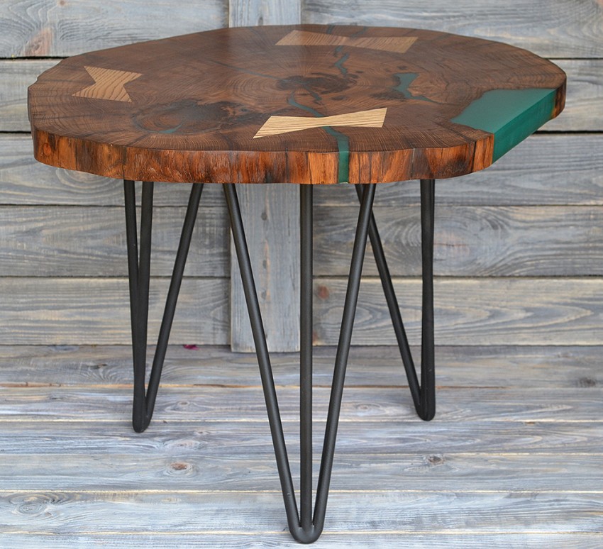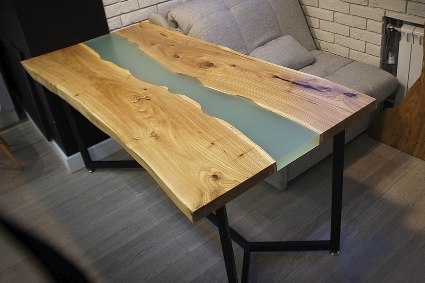 После добавления в эпоксидку 10% сажи и до 10% бронзовой пудры вы получите средство кофейного цвета. Чтобы получить белый цвет – досыпьте обычного мела. Сажа сделает смолу черной. С помощью цемента вы добьетесь серого оттенка. В продаже имеются красный, зеленый, синий пигменты, которые сделают ваш стол еще более оригинальным, подходящим к конкретному интерьеру.