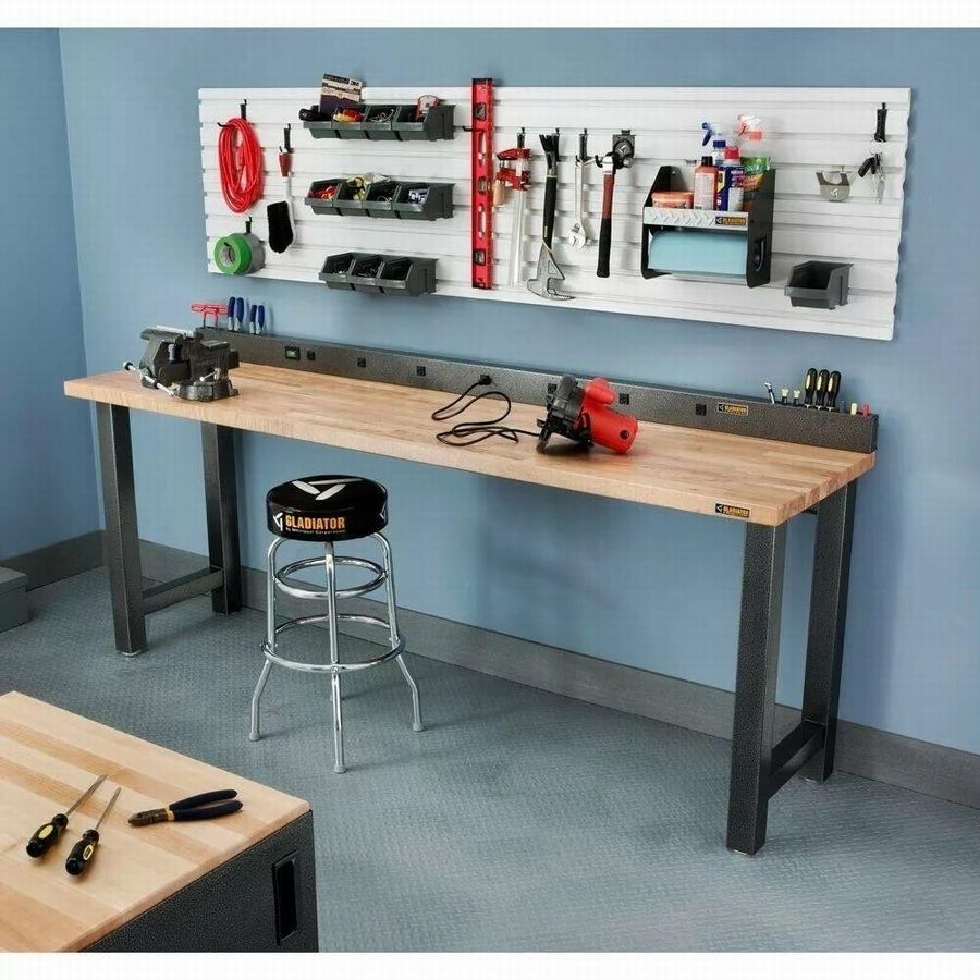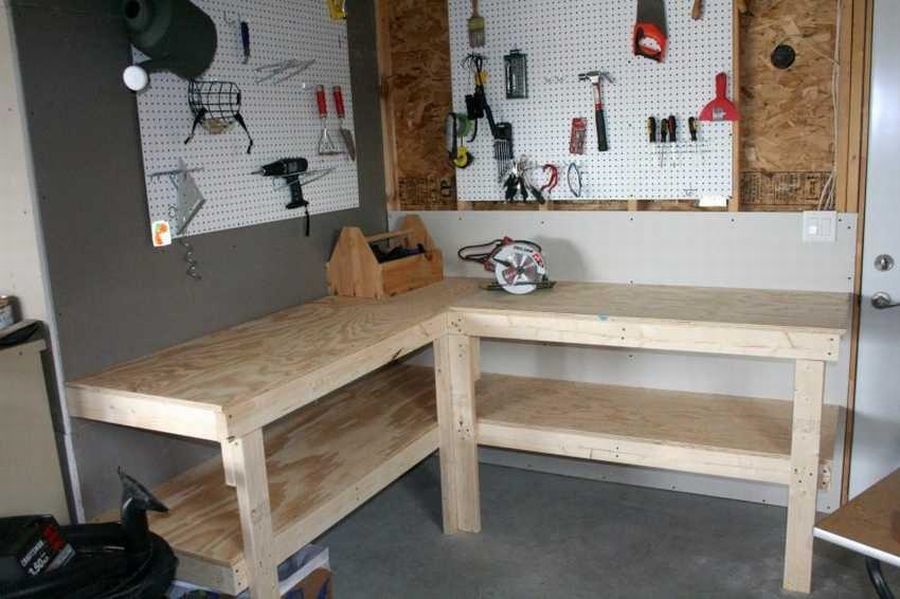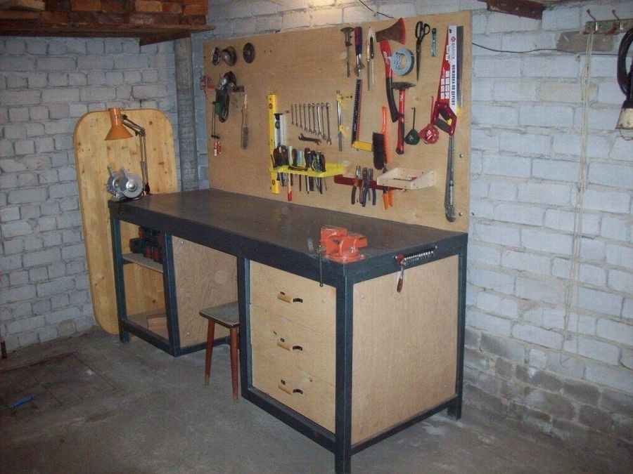 : после изготовления прочного и надежного рабочего стола, зону вокруг него необходимо оборудовать розетками, дополнительным освещением с помощью настенных ламп. На стенах можно сделать дополнительные полки для хранения инструментов.
