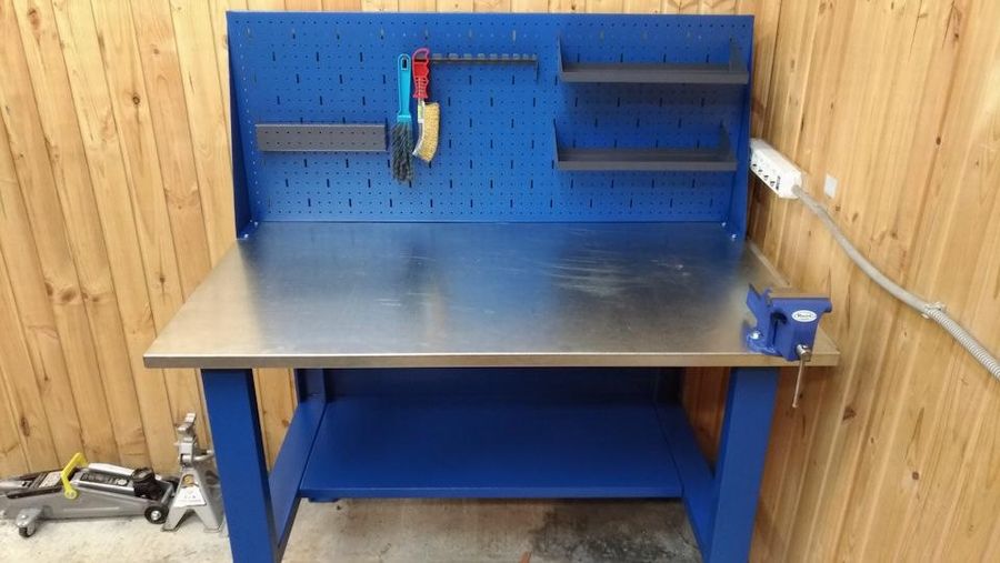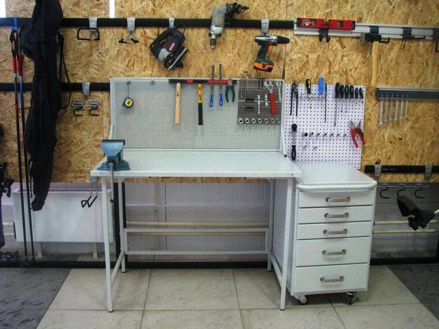 Слесарный стол с металлической столешницей. Если стенки стола сделать перфорированными, туда можно повесить свои инструменты. Благодаря перфорации разместить на такой стене небольшие полки будет проще.