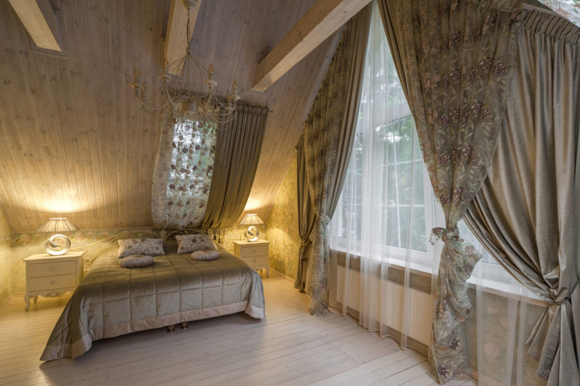 Присутствие плотных гардин здесь необходимо, потому что они защищают комнату от ярких солнечных лучей и посторонних глаз, что особенно важно в комнате, предназначенной для здорового сна. Необходимо, чтобы они сочетались с остальным декором, создавая единую композицию