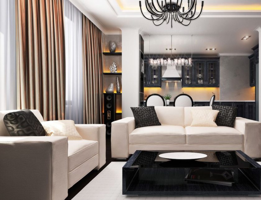 Прежде всего шторы в зал в стиле модерн стоит выбирать, отталкиваясь от их цвета и фактуры