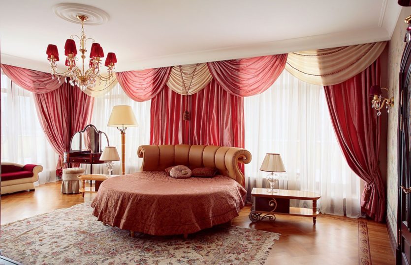 Ткань можно декорировать обилием драпировок, ламбрекенами, жабо, декоративными подхватами.