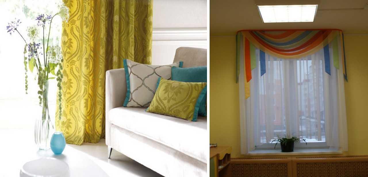 Для придания интерьеру своей «изюминки» – можно поэкспериментировать с цветом портьер, которые будет отличаться от основной расцветки штор.