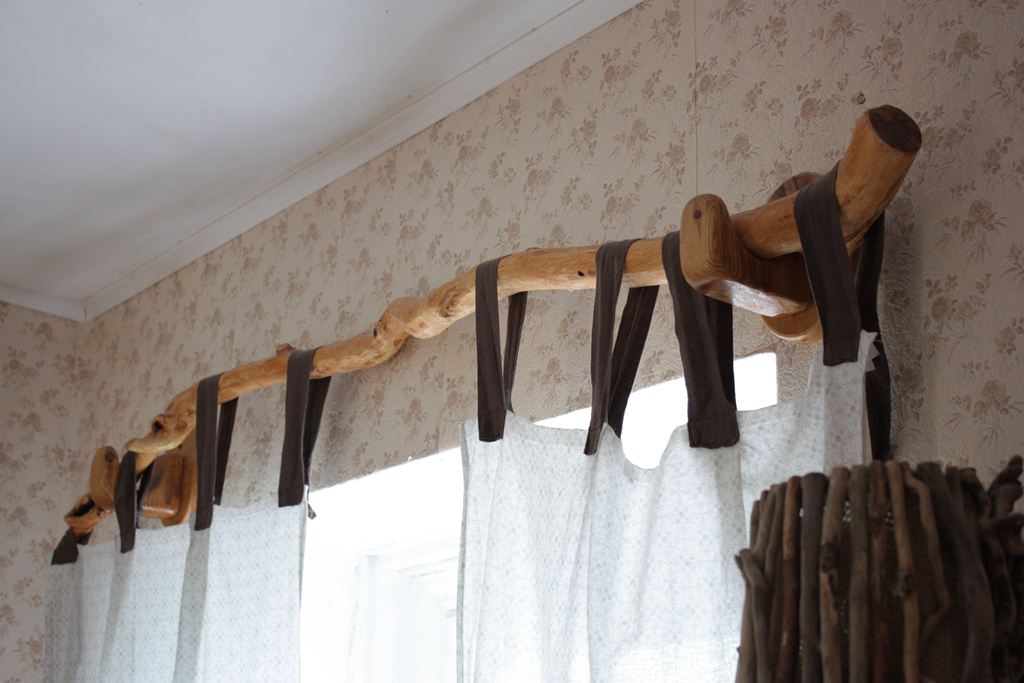 Вместо штанги карниза иногда используют толстый металлический прут или декоративную ветку.