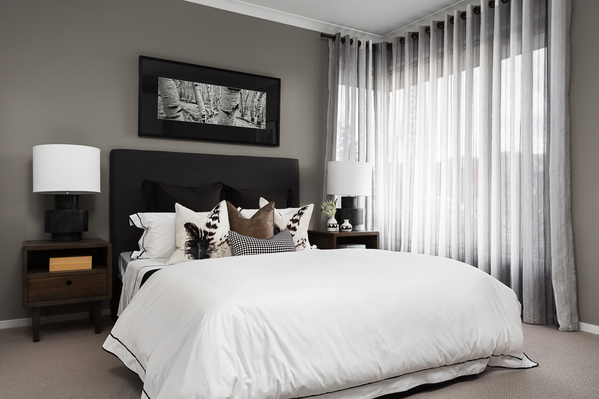 На фото спальня со шторами из легкой ткани на люверсах на деревянном карнизе.