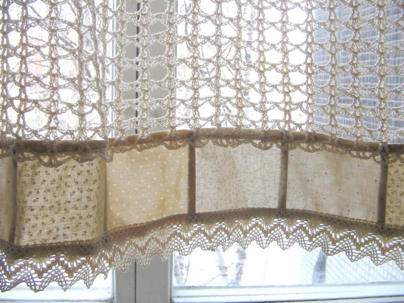 Если в комнате установлен стеклопакет, то его дополнить помогут шторки средней длины с кружевами.