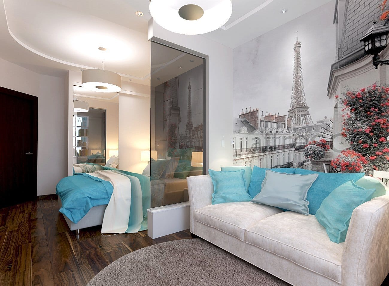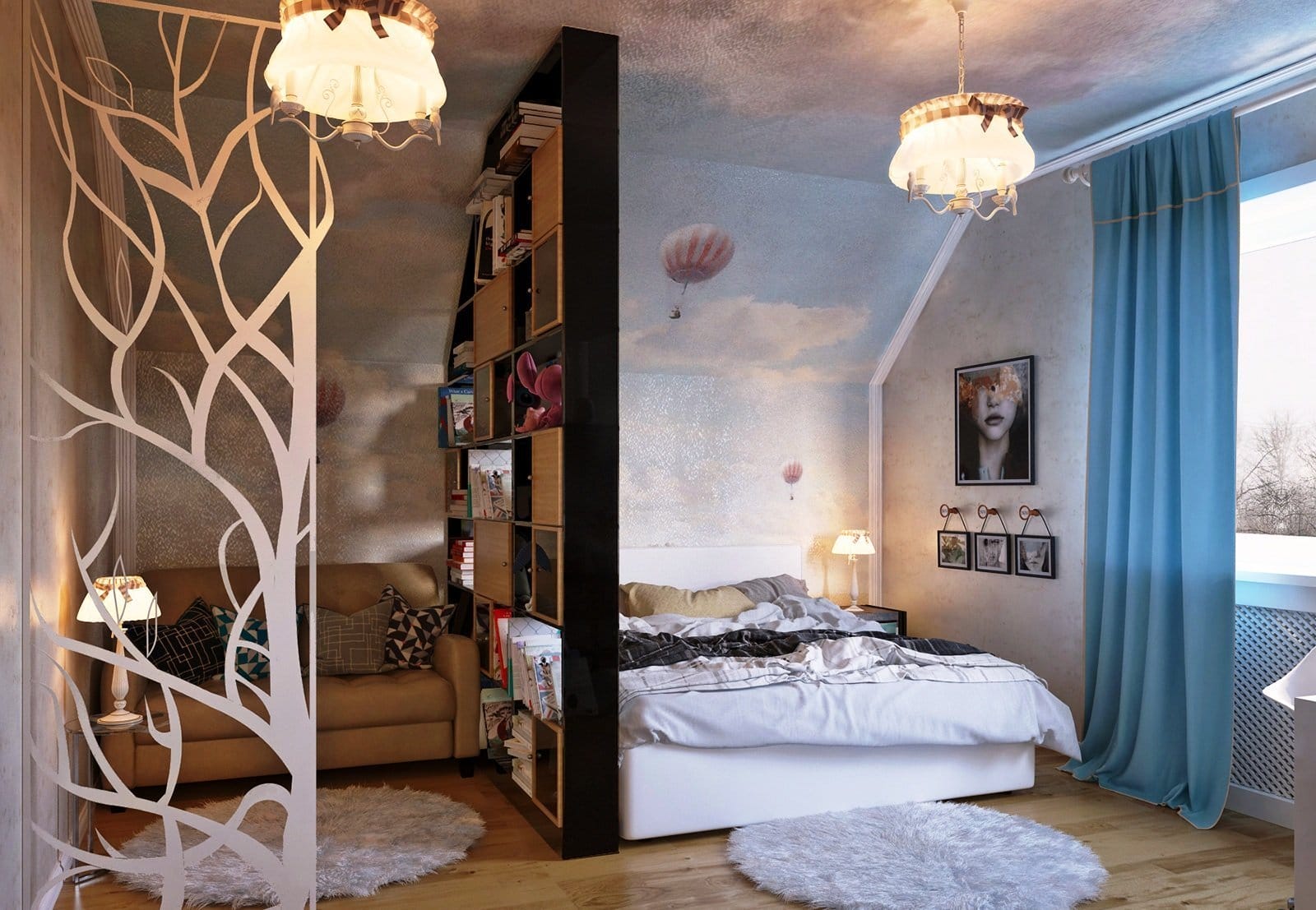 Шкаф для вещей и диванчик смогут неплохо соседствовать с собранной моделью. На противоположной стороне можно установить небольшую стенку для хранения книг, журналов и статуэток. Дополнить ее смогут телевизор, музыкальный центр. Между двумя частями помещениями можно уложить небольшой стилизованный коврик.