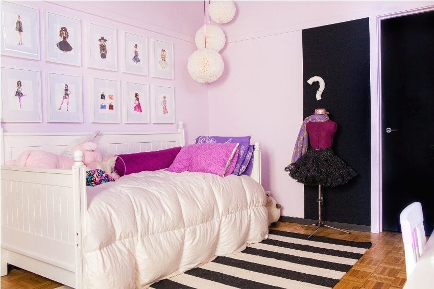 Кровать следует устанавливать параллельно организованному столику, оставляя достаточное пространство между этими зонами для перемещения. Заменить кровать сможет раскладная софа, располагаемая перпендикулярно столику. Оставшаяся свободная часть помещения отлично подойдет для проведения игр с друзьями или самостоятельных игр, танцев молодой леди.