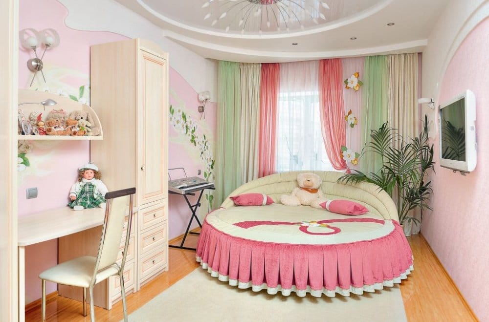 Просторные жилые помещения намного проще обустраивать, чем небольшие комнатки. Поэтому центральную часть рекомендуется оставить свободной. Во время встречи с друзьями владелица сможет играть и танцевать.