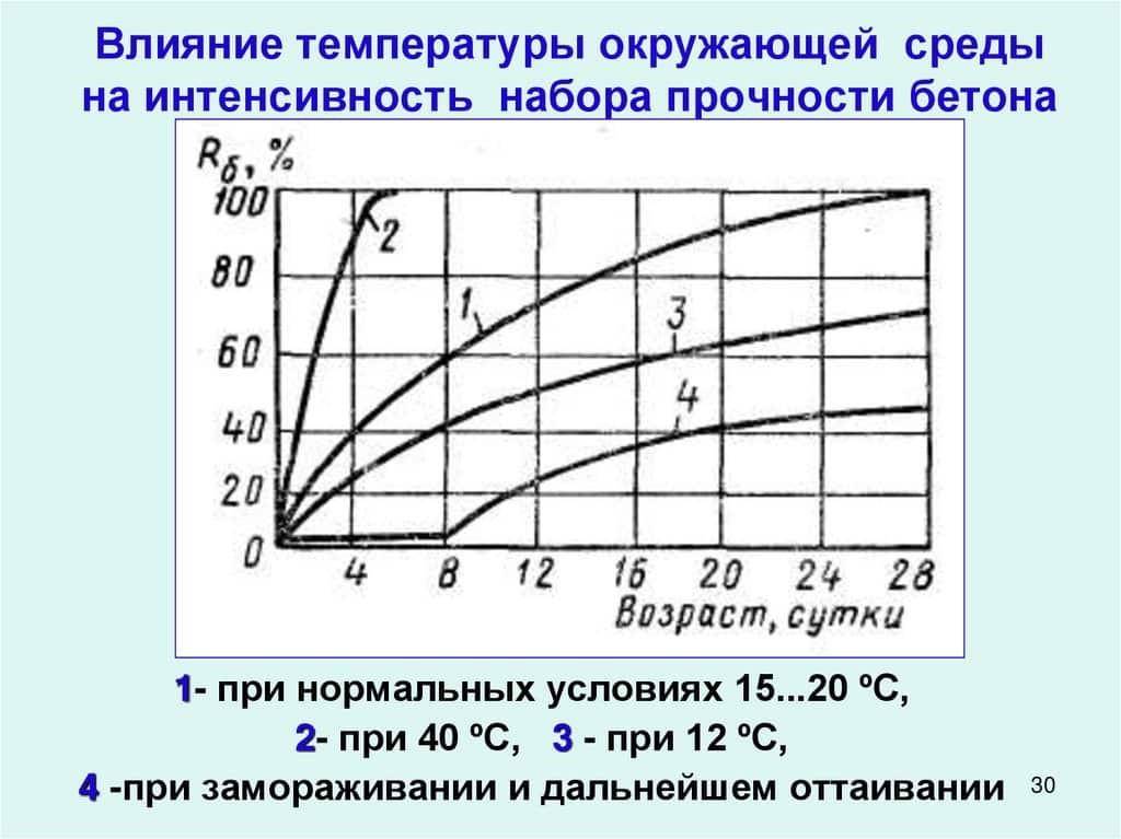 В зависимости от температуры, марочную прочность он может приобрести за 14 и более дней, и чем холоднее воздух – и бетонная масса – тем больше времени потребуется для набора полной прочности.