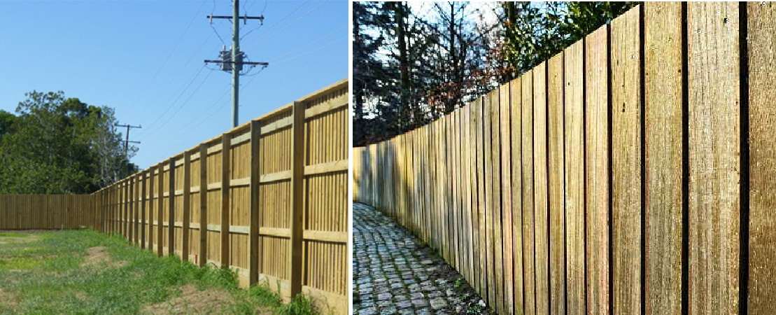 Самые экономичные шумопоглощающие заборы строят из дерева. Доски плотно подгоняют друг к другу, а сверху, со стороны источника шума, набивают деревянные планки, которые задают разные направления для рассеивания звуковых волн. Их размещают либо «елочкой», либо перпендикулярно и параллельно друг другу, с некоторым интервалом.
