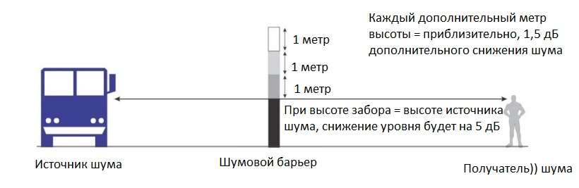 Высота так же имеет свою немаловажную роль. Ведь экран высотой 2 метра не защитит 10-метровое здание, правильно? Нужно, чтобы шумовая тень охватывала это здание. Также объект изоляции не должен находится далеко от шумозащитных конструкций, так как опять же, может не попасть в шумовую область.