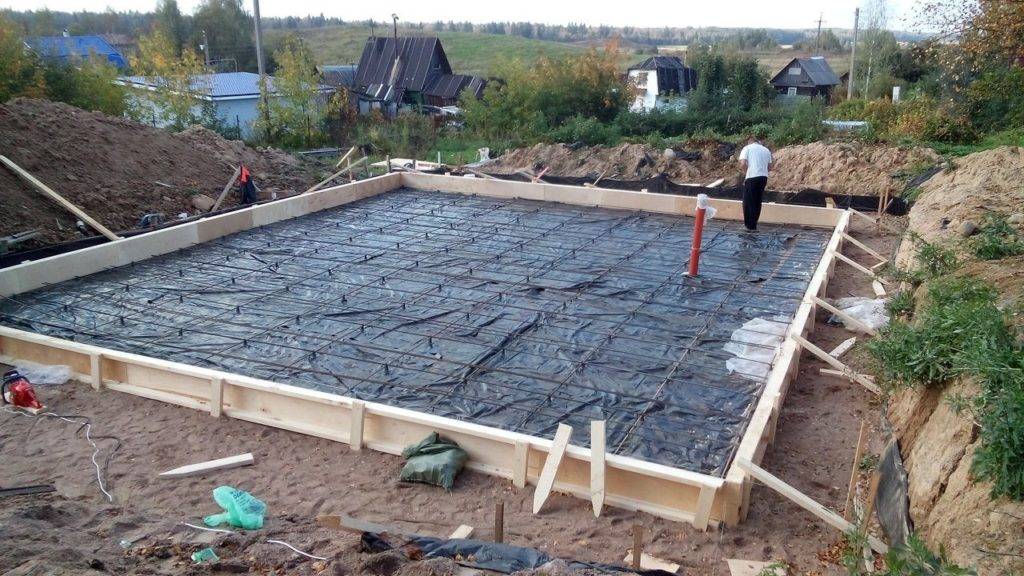 После, конструкцию оставляют до застывания бетона. Предварительно фундамент требуется накрыть плёнкой и периодически поливать, чтобы избежать пересыхания верхнего слоя бетона.