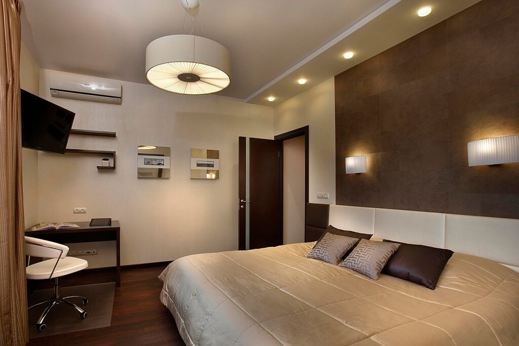 Осветительные приборы подбираются в зависимости от размеров спальни, высоты потолков, выбранного стиля и функционала комнаты.