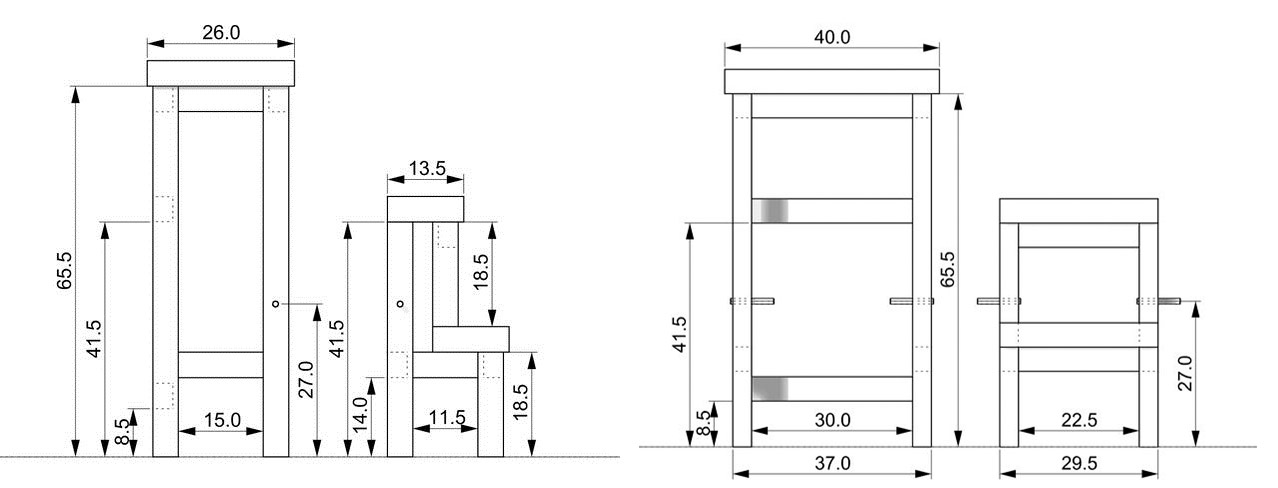 Размеры стула-лестницы должны учитывать, с одной стороны, эргономику, т.е. повторять формы тела, а с другой – отвечать требованиям для лестниц. Оптимальными размерами для ступеней табурета-лестницы является высота 15-20 см. Таким образом, чертежи стула-стремянки соотносятся с размерами и количеством ступеней. У маленьких подставок может быть две ступеньки, но у полноценных и полноразмерных стульев их обычно 3-4.