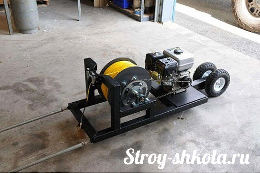 - Наматывают на барабан трос, закрепив его конец на валу. Второй конец троса снабжают прочным карабином. Для удобства передвижения лебедку закрепляют на раму с колесной парой с помощью хвостовика.