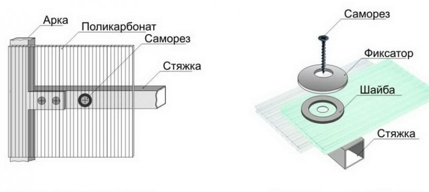 После сбора каркаса можно приступить к его обшивке. Каждый отрез полотна из поликарбоната крепится при помощи саморезов, фиксаторов и шайб