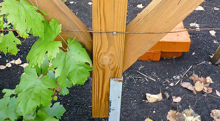 Для подвязки винограда в центральном ряду я использовал деревянные столбы, закрепив саморезами. (9).