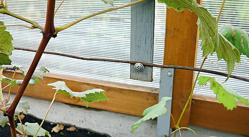 Для крайних рядов закрепите висячие стойки (шпалеры) на ригелях из металлического уголка (25 мм). Они висят на высоте 40 см от уровня почвы (10). Для чего? Чтобы удобней было укрывать виноград на зиму, укладывая нетканый укрывной материал по металлическим дугам.