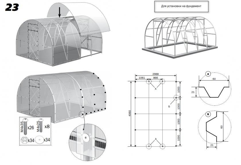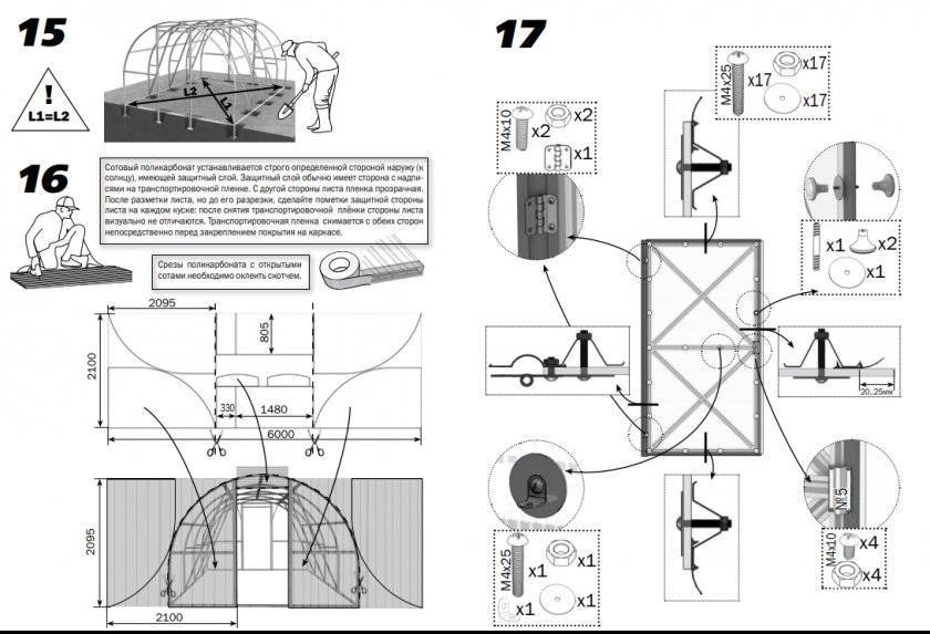 Монтаж теплицы проводят вдвоем, по крайней мере, закрепляют листы поликарбоната. Если существует неуверенность в собственных силах, надежнее обратиться в компанию, предлагающую услуги по сборке (обычно это продавец теплицы). В упакованном виде теплица весит от 60 до 120 кг. Удобнее приобрести поликарбонат сразу у продавца, в таком случае вам по чертежам вырежут детали для торцов (дверей, форточек). Комплекты заготовок легко помещаются в багажник легковой машины, а вот для перевозки листов поликарбоната понадобится фургончик.