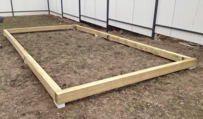 - Прикрепите раму из бруса 50×150 мм на бетонные столбики по периметру строения.