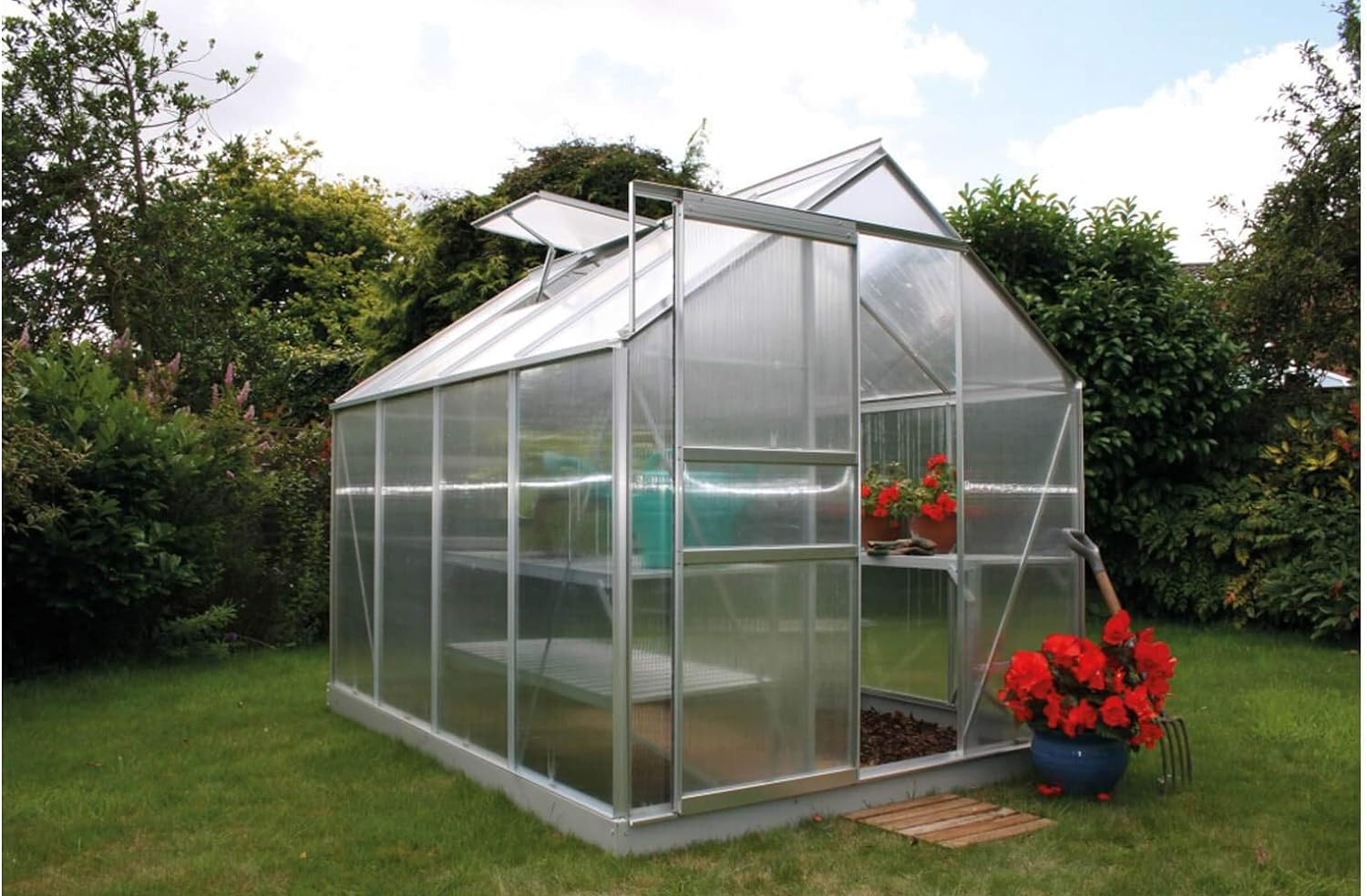 Эта теплица отличается не только функциональностью, но и стильным дизайном. Ее каркас из алюминиевой рамы с порошковым покрытием надежно защищен от коррозии. Конструкция обладает повышенной жесткостью и долговечностью. Высота теплицы 260 см позволяет работать в полный рост. Имеются широкие двери и форточки для проветривания.