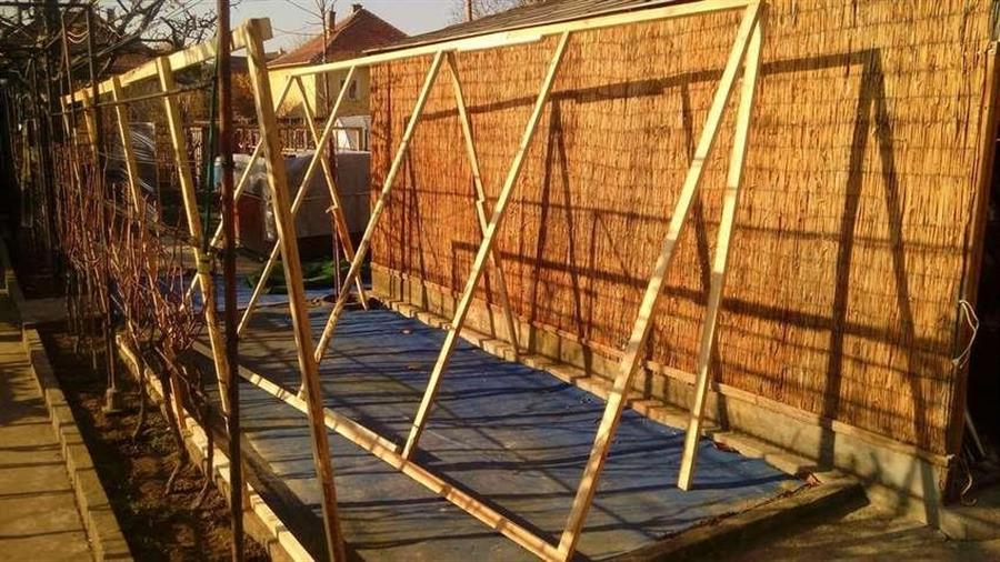 - Пленка. Самый доступный и легкий материал, который не оказывает давление на древесину. Для стропил и стоек конструкции используйте брусья среднего размера, к примеру, 5х5 см – но основание лучше делать из более прочного материала. Срок службы пленки небольшой – около одного сезона. На зиму ее демонтируют, т.к. пленочное покрытие не выдержит сильных проливных дождей и снега.