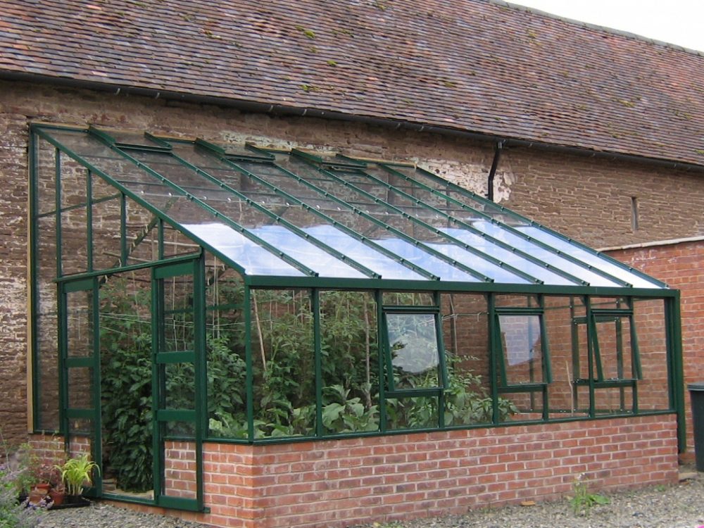Такая теплица сберегает владельцам стройматериалы и квадратные метры, что немаловажно для скромного по размеру участка. Подобные стеклянные проекты оснащаются, как правило, односкатной, с наклоном, крышей. Желательно выбирать размещение с южной стороны, чтобы рассада и овощи не страдали от недостатка живительной солнечной энергии