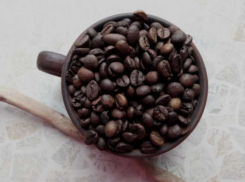 Декоративное дерево с кроной из кофе с бронзированием и искусственными тканевыми цветами.